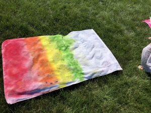 ۳. روی یک سطح صاف یا چمن ، دستکش های خود را بپوشید و رنگ مخلوط را با آب گرم شروع کنید. چه رنگهایی از رنگهای اصلی ساخته می شوند؟ با استفاده از چرخ رنگ، کدام رنگ ها روی حوله به بهترین شکل نزدیک یکدیگر می شوند.